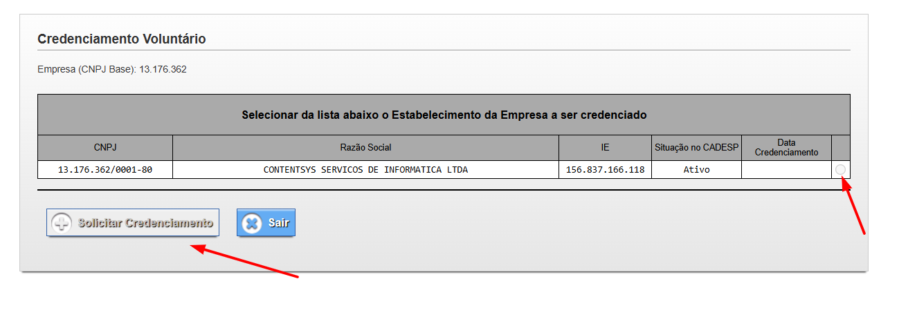 Assim que logar, clique para selecionar a empresa no canto direito e depois no botão “Solicitar Credenciamento”