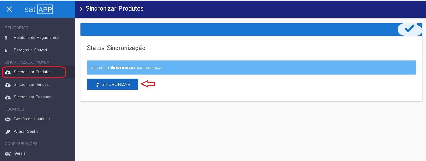 – No menu lateral esquerdo, acesse Sincronizar Produtos. Depois clique no botão Sincronizar.