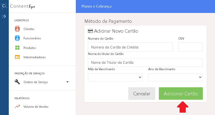 Veja abaixo o passo a passo de como adicionar o cartão de credito no sistema para cobranças automáticas.